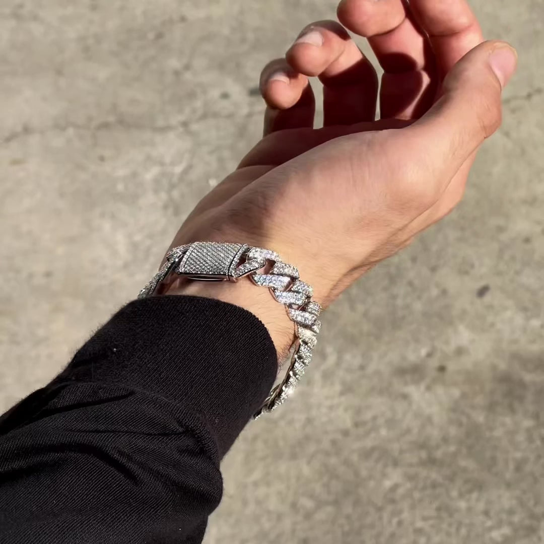 El Brazalete Cubana Prong 15 mm Oro Blanco lleva el diseño clásico a su versión helada. Ice agresivo, engaste prong y un acabado blanco que congela la atención.