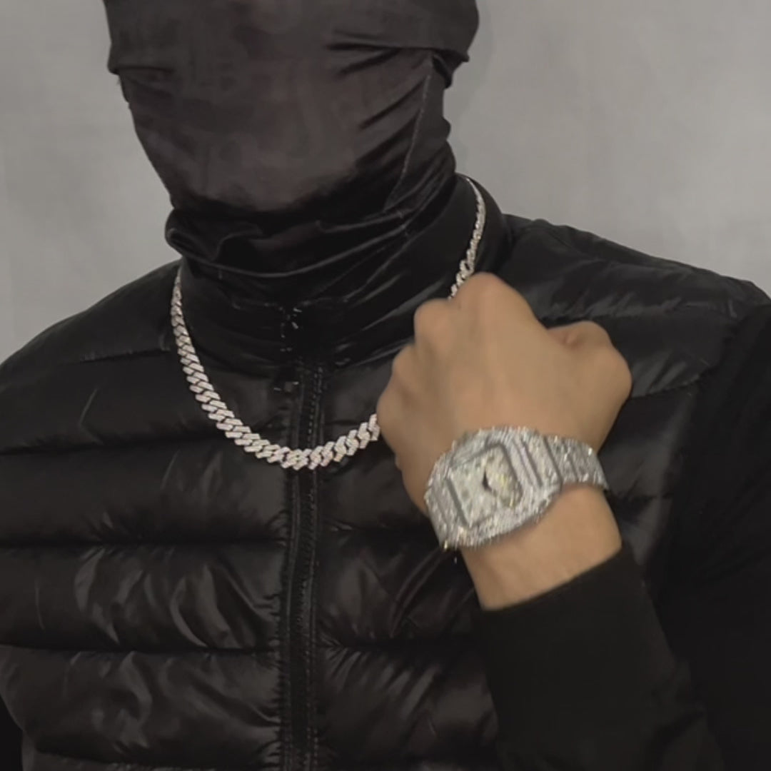 El Prong Ice en su forma más limpia. La Cadena Cubana Prong 10 mm Oro Blanco combina engaste agresivo con un acabado helado impecable. Pura estética de lujo.